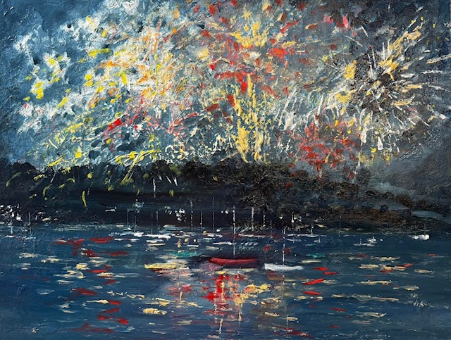 Fireworks over Flushing is painted in oils currently unframed.