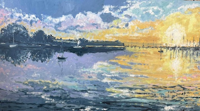 A oil painting of the sun rising over Penryn river £395.00 beautifully framed in wood. measurements 49cm x 74cm
