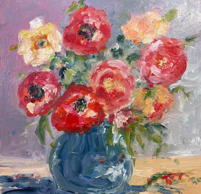A still life in oils a vase of Cornish daffs £125.00 deep box frame.